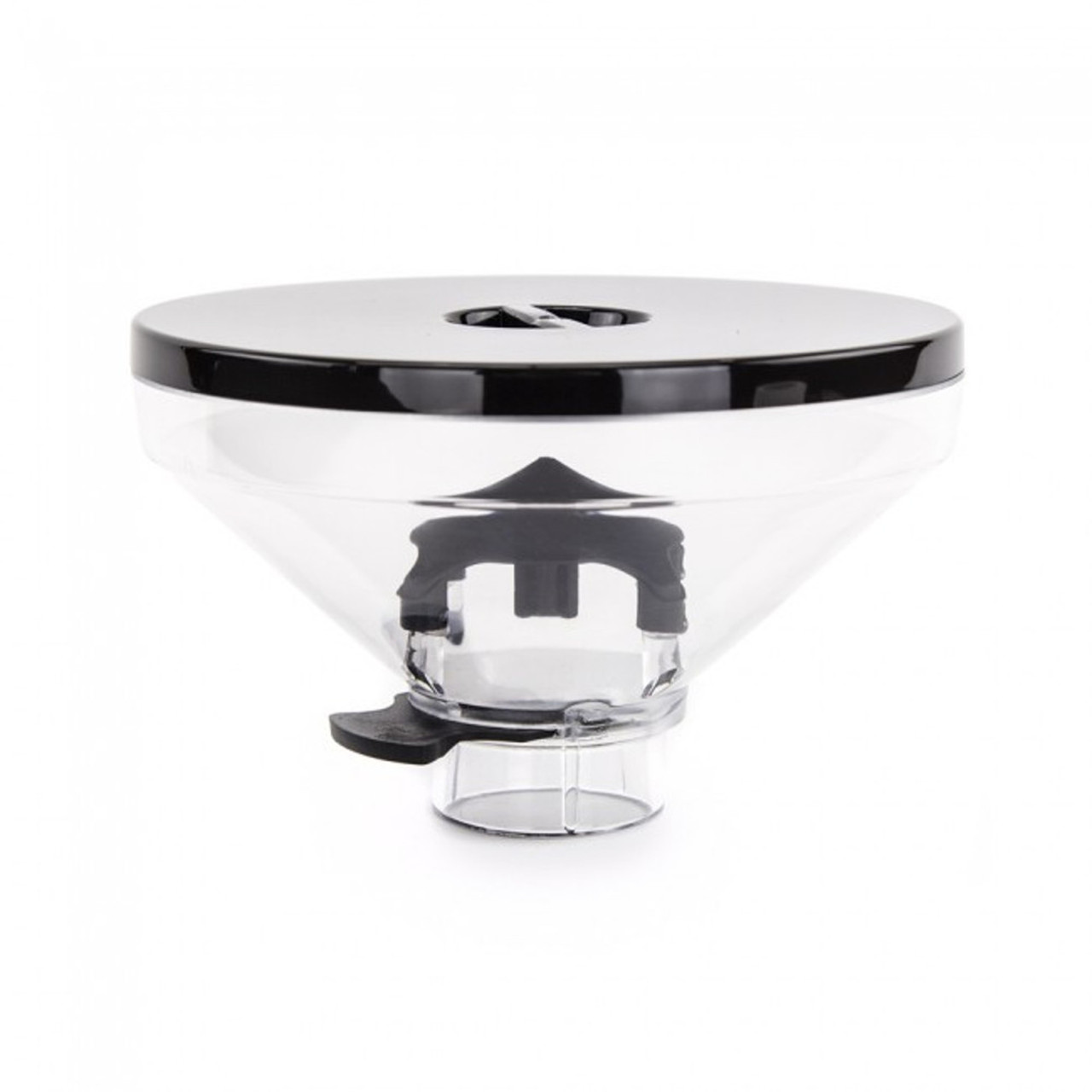 Kompletní sestava: Součástí balení je jak samotná násypka, tak černé vrchní víko a integrované posuvné „šoupátko“ pro bezpečné uzavření spodního otvoru při sundávání násypky.